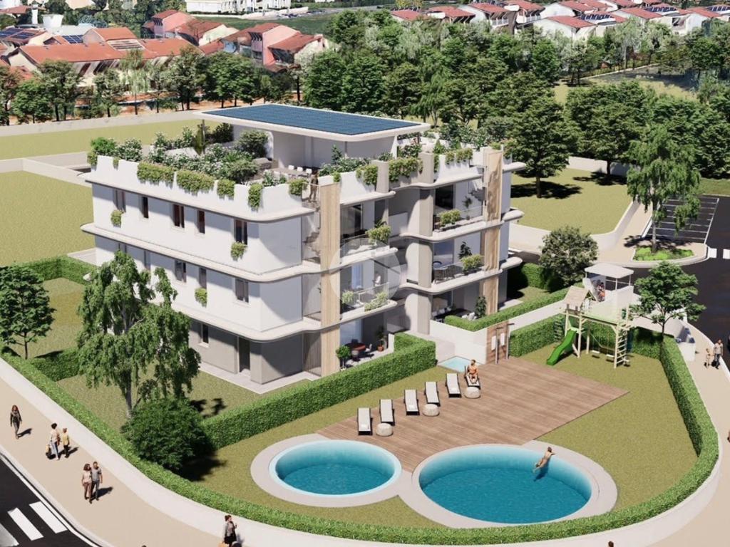 Le soluzioni sorgono in contesto dotato di grandi spazi verdi e piscina comune: ubicate in una palazzina di sole 12 unità tutte le soluzioni sono dotate di garage (singolo o doppio), ascensore e costruite secondo i più moderni standard qualitativi.